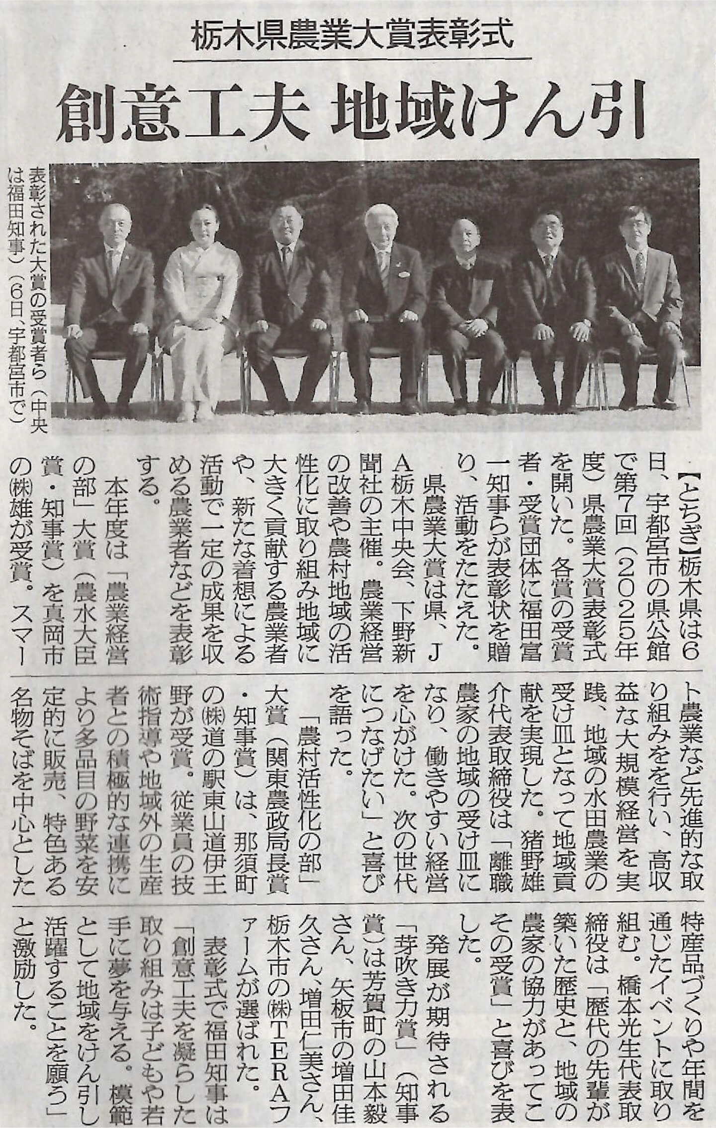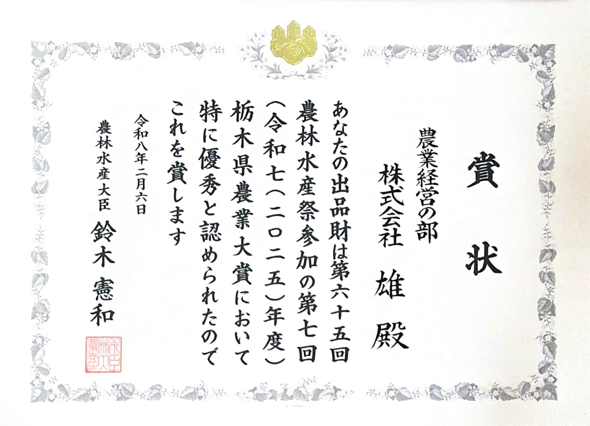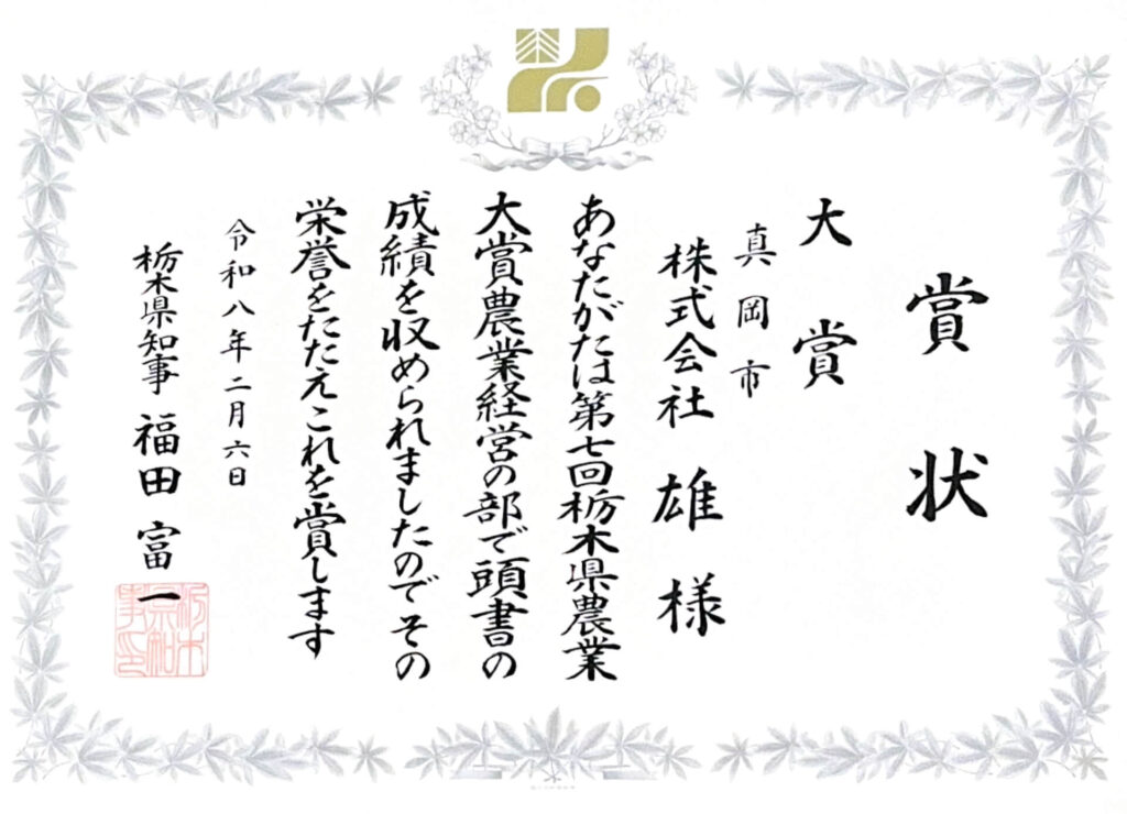 この度、第7回(令和7(2025)年度)栃木県農業大賞 農業経営の部において、大賞(農林水産大臣賞・栃木県知事賞)を受賞いたしました。