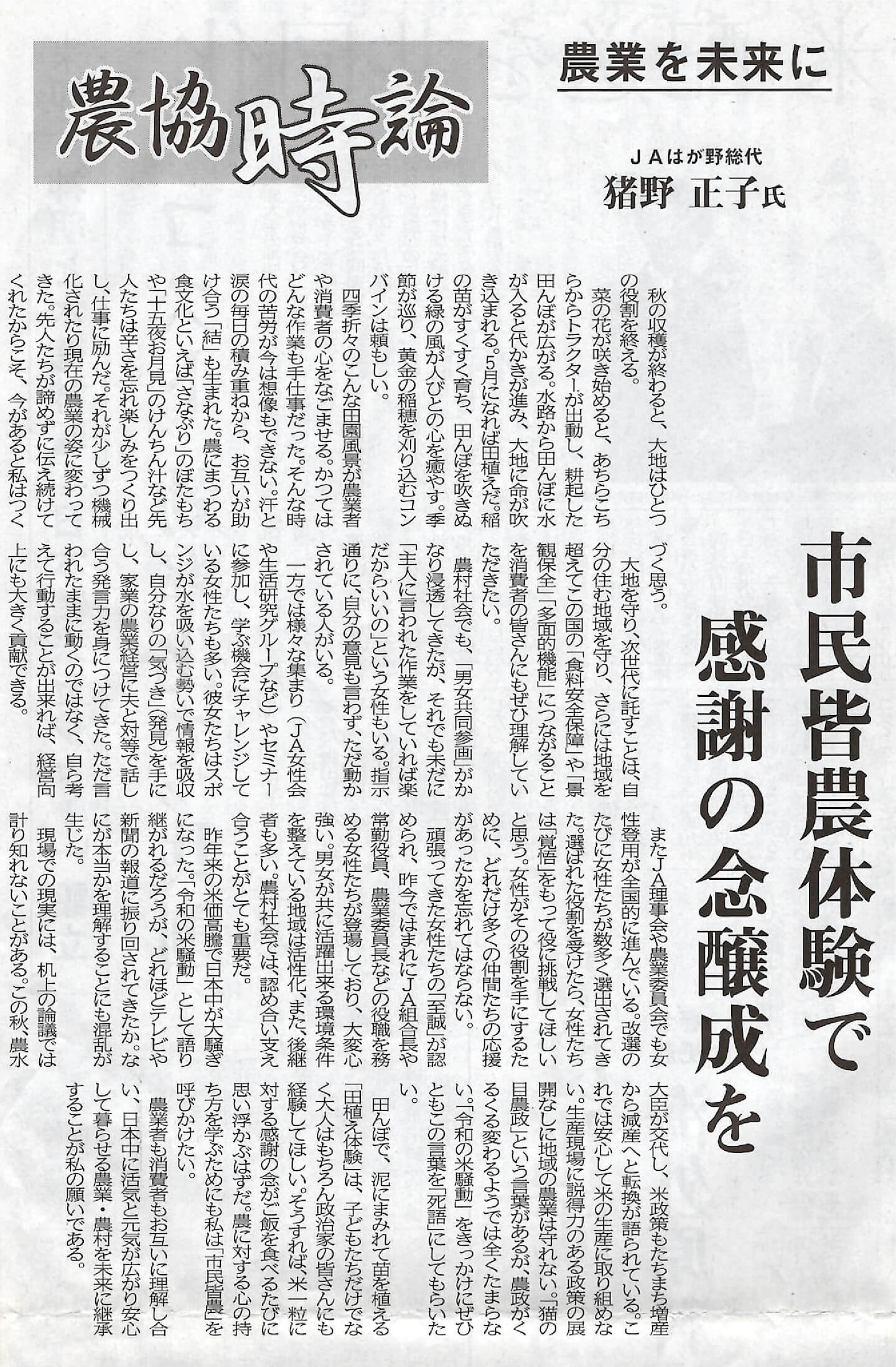 当社副社長の猪野正子が、女性で初めて農業協同組合新聞の「農協持論」に掲載されました。