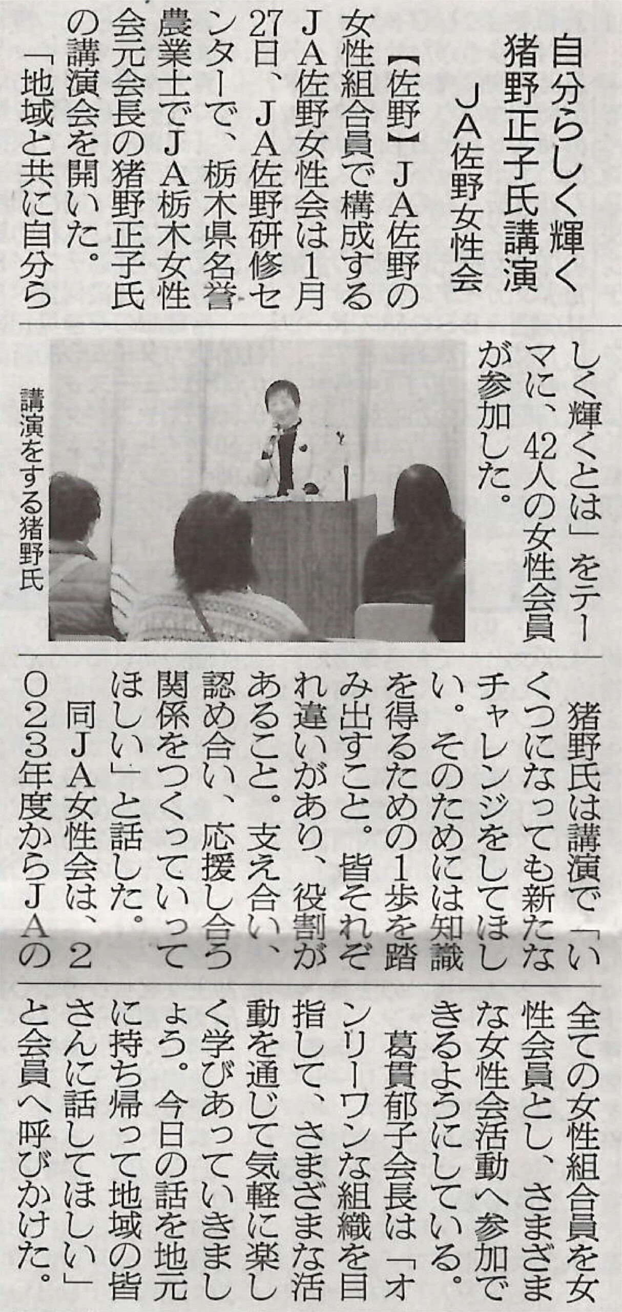 当社副社長の猪野正子が、JA佐野女性会での講演の様子が日本農業新聞に掲載されました。