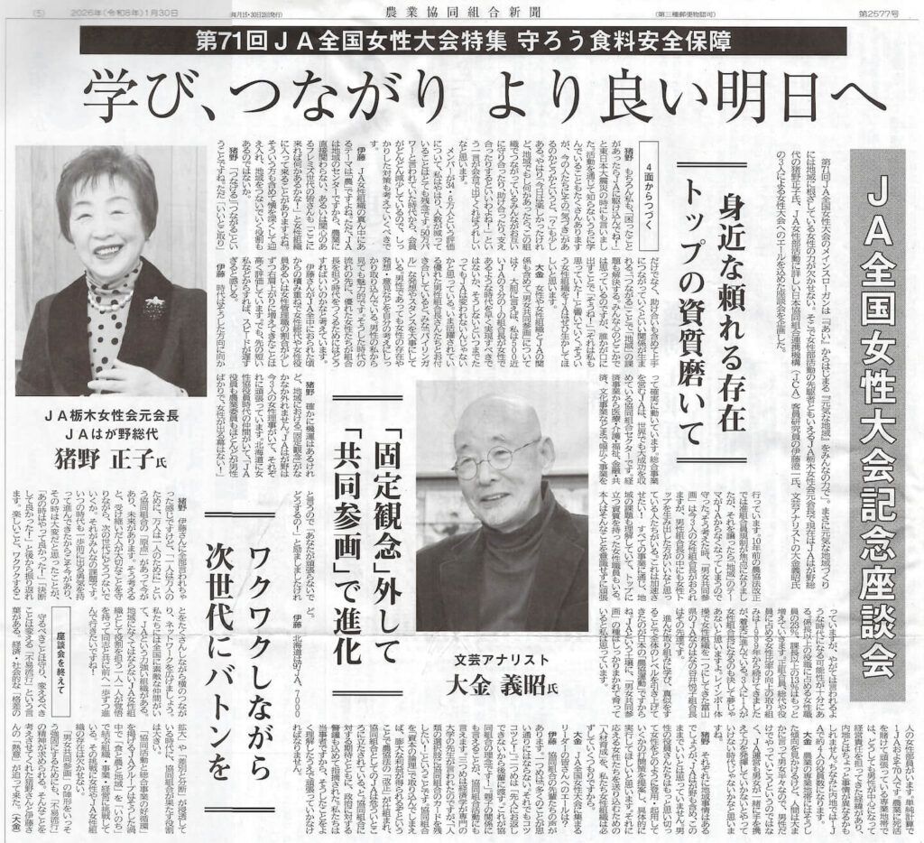 当社副社長の猪野正子が、「第71回 JA全国女性大会特集」の内容が、農業協同組合新聞に掲載されました。