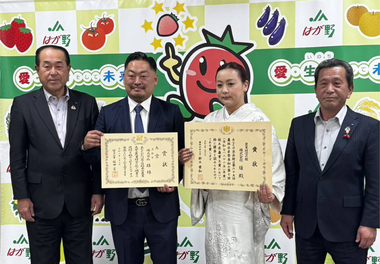 株式会社雄は、2月6日(金)にJAはがの本店を訪問し、代表理事組合長、代表理事専務へ「第7回(令和7(2025)年度)栃木県農業大賞 農業経営の部 大賞 農林水産大臣賞・栃木県知事賞」受賞の報告とご挨拶をさせていただきました。