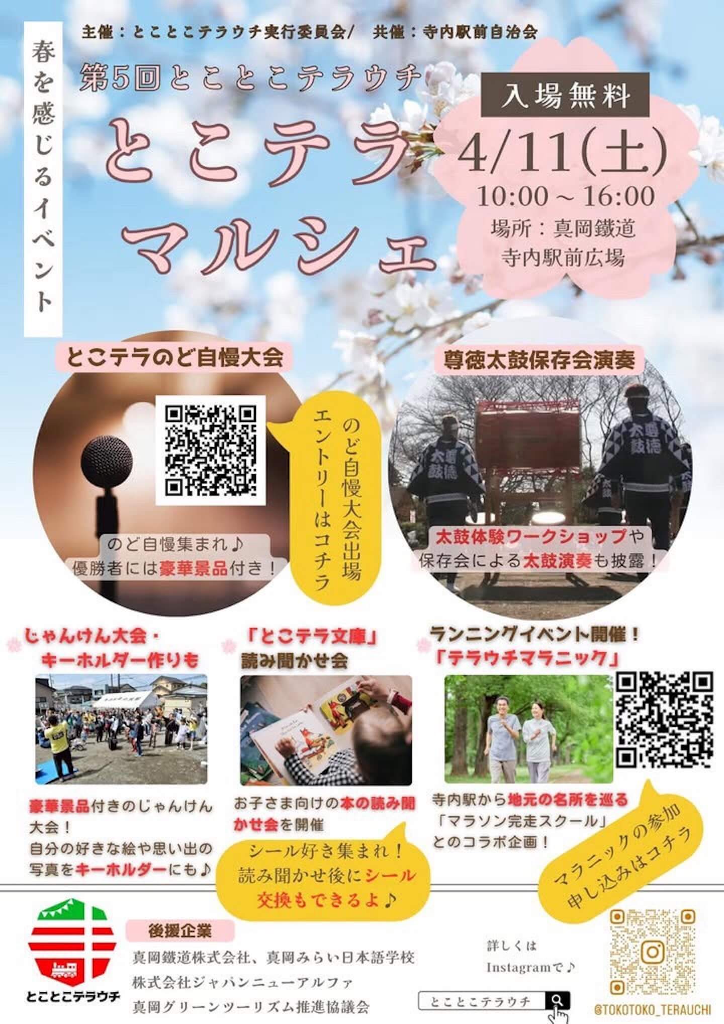 令和8年4月11日(土曜日)に真岡鐵道寺内駅前広場で「第5回とことこテラウチ とこテラマルシェ」が実施されます。とこテラグルメの出店の他にも、キーホルダー作りやシール交換、のど自慢大会、ランニングイベントなどのインベントが盛りだくさんのイベントです。