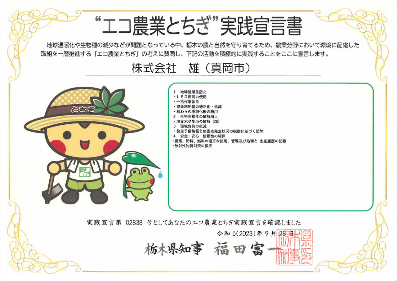 当社は、環境に配慮した持続可能な農業を推進する「エコ農業とちぎ実践宣言」を行っています。化学肥料や農薬の使用を抑え、自然との調和を大切にした栽培管理に努めることで、環境への負荷を軽減しながら、安全で安心な農作物の生産を目指しています。