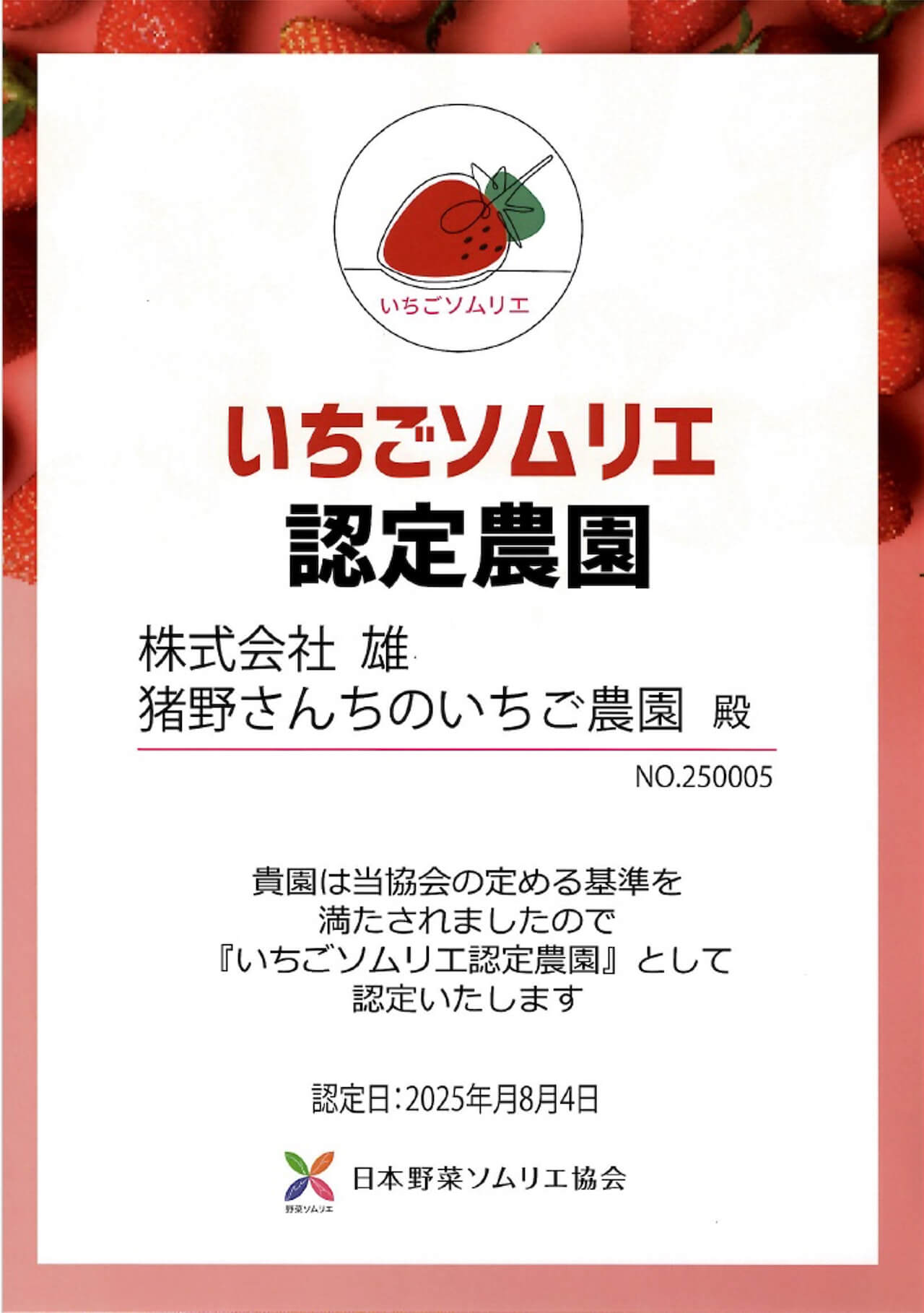 当社は、いちごに関する専門的な知識と技術を有する「いちごソムリエ認定農園」です。品種ごとの特徴や栽培環境、味わいの違いを深く理解し、より高品質ないちごづくりに活かしています。生産者としての責任を持ち、いちごの魅力を正しく伝えることを大切にしています。