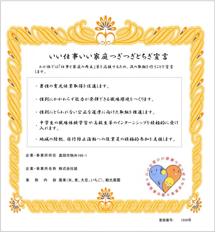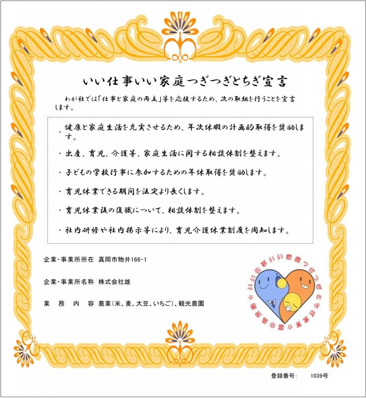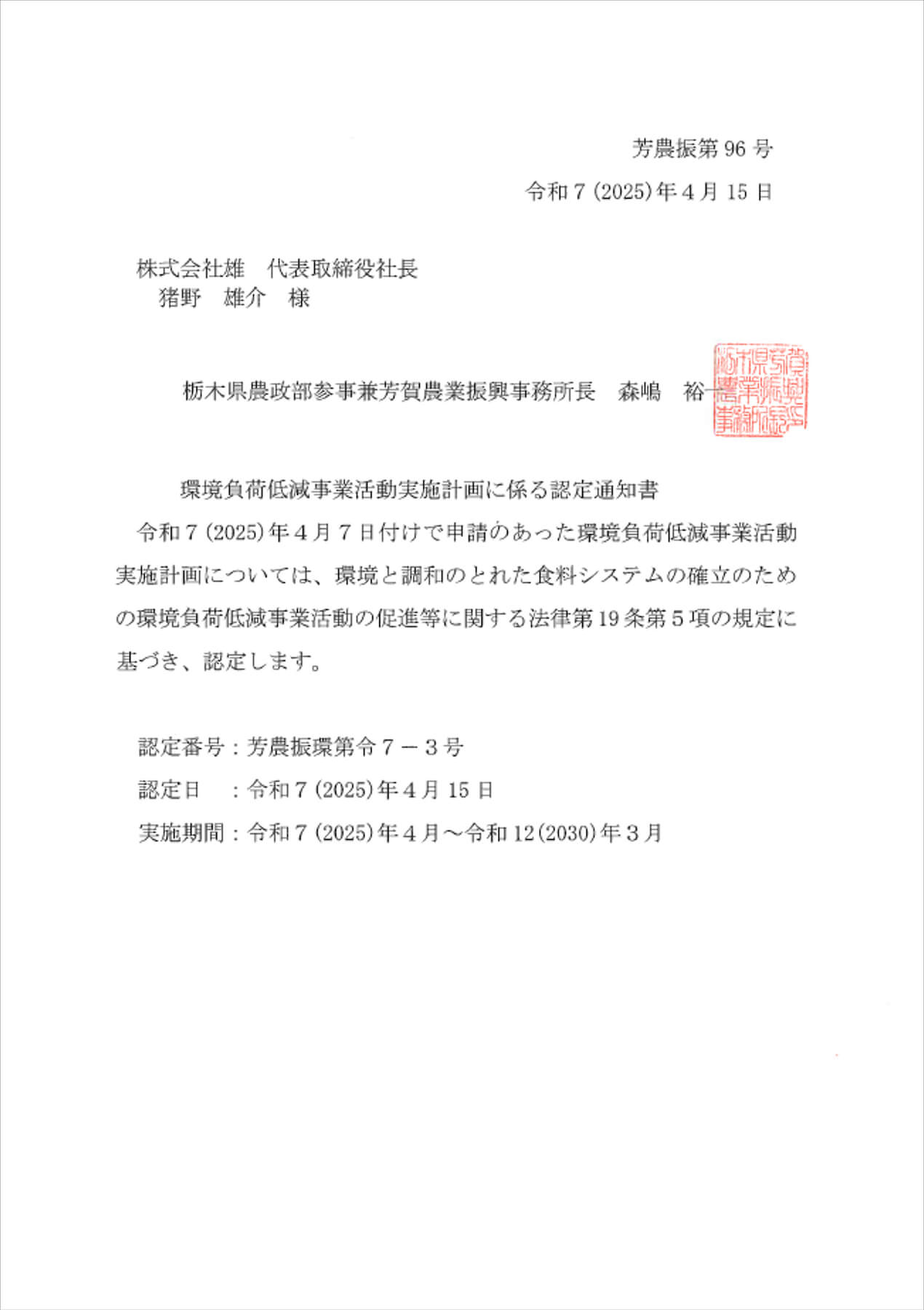 地球環境の保全と持続可能な農業の実現を目指し、「みどりの食料システム法」に基づく環境負荷低減の認定制度「みどり認定」を、米・大豆・いちごの各部門で取得しています。地域農業のモデル的経営体として、環境にやさしい資材の使用や効率的な生産管理体制の構築に取り組んでいます。