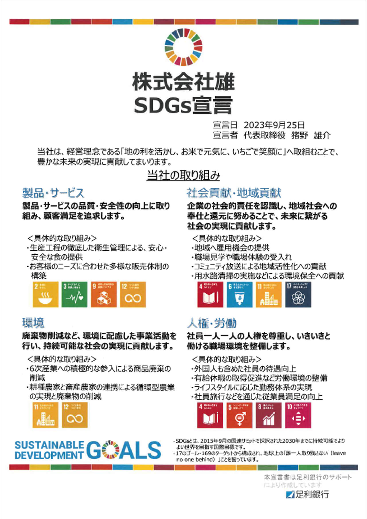 地域に根ざした企業として、持続可能な未来づくりに貢献するため「SDGs宣言」を行っています。環境への配慮はもちろん、地域社会との共生や次世代を育み、安心・安全な食品を届ける活動を通じて、栃木から持続可能な社会の実現を目指します。